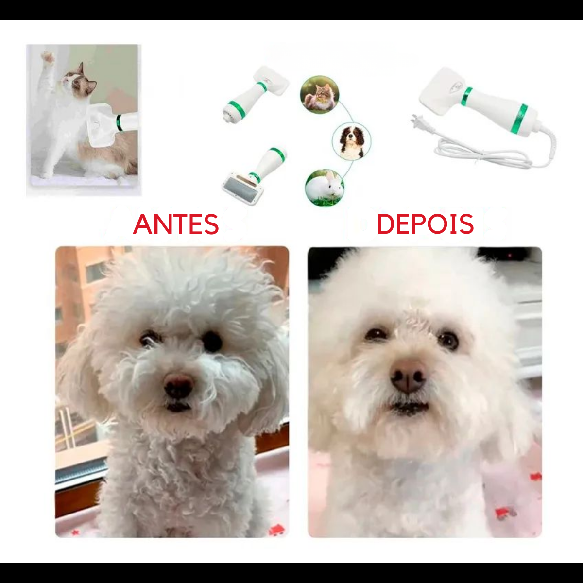 Cansado da maratona pós-banho? Seu pet se assusta com o barulho do secador tradicional e você perde horas tentando secar e pentear separadamente?